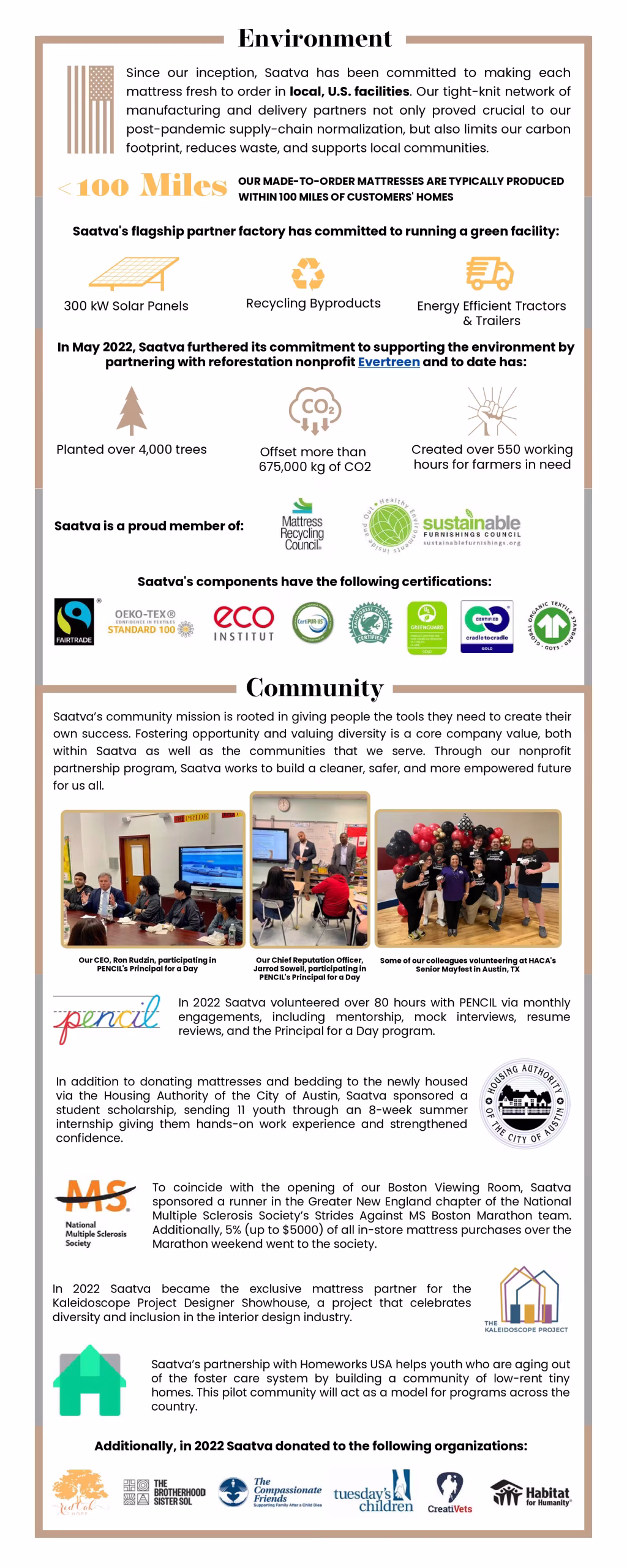 Saatva is pleased to share its 2022 Social Impact Report, which highlights the work being done internally and externally across our business to better serve our most important constituencies: our employees, our customers, our communities, and the environment.