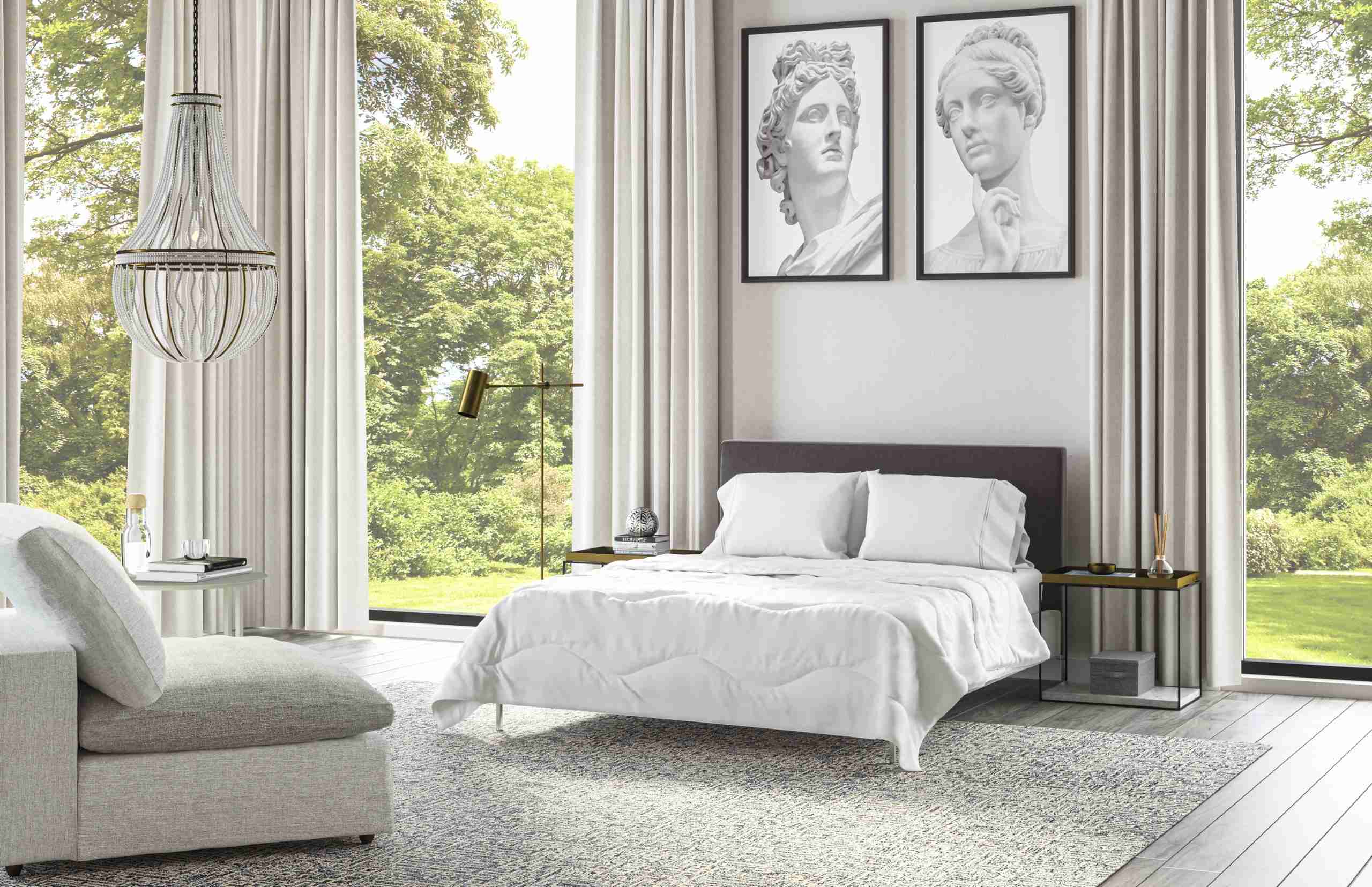 Saatva’s Comforter Collection combines a plush blend of 3D down alternative fibers and sustainable lyocell fill, encased in a breathable 100% organic cotton shell. This innovative construction ensures superior moisture-wicking properties and temperature regulation, keeping sleepers cozy yet comfortable in any climate.