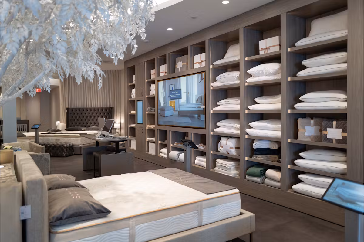 Thanks to a partnership with Samsung, the Houston Viewing Room is outfitted with state-of-the-art displays and the latest behavior-sensing technology to help customers discover, personalize, and build their ideal sleep experience. In addition to the digital “hero” wall, composed of nine Samsung VM46T-U 46-inch Full HD Ultra-Narrow Bezel Video Wall Displays, information kiosks at each bed display allow visitors to interact with the collection at their own pace, with knowledgeable Sleep Guides on hand to assist and answer questions.