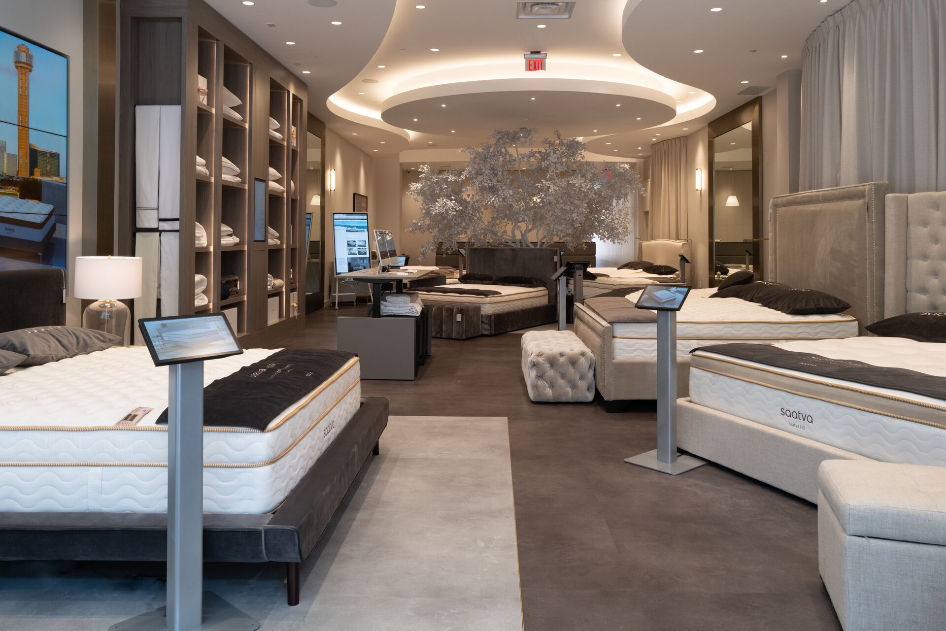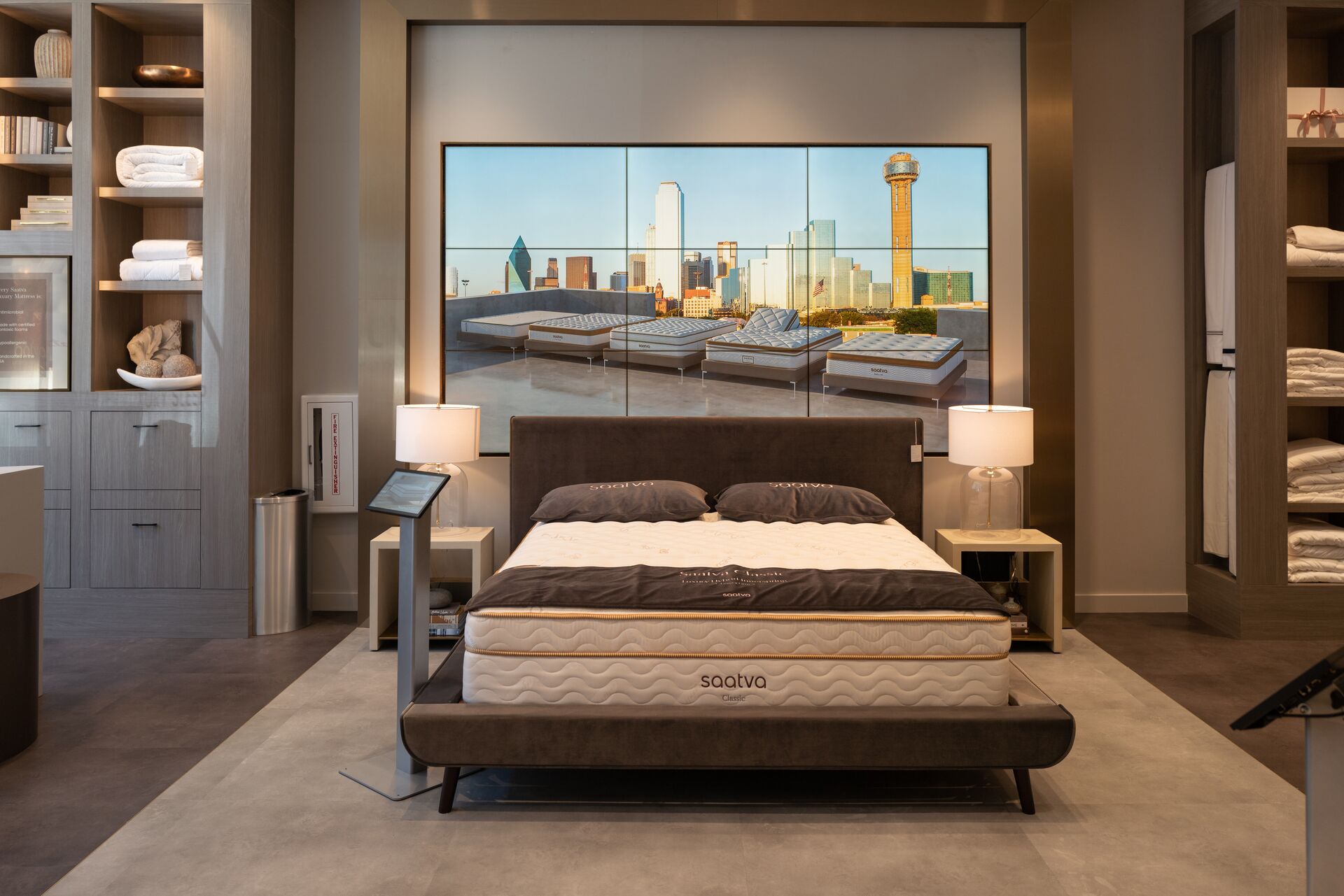 Thanks to a partnership with Samsung, the Dallas Viewing Room is outfitted with state-of-the-art displays and the latest behavior-sensing technology to help customers discover, personalize, and build their ideal sleep experience. In addition to the digital “hero” wall, composed of nine Samsung VM46T-U 46-inch Full HD Ultra-Narrow Bezel Video Wall Displays,  information kiosks at each bed display allow visitors to interact with the collection at their own pace, with knowledgeable Sleep Guides on hand to assist and answer questions.