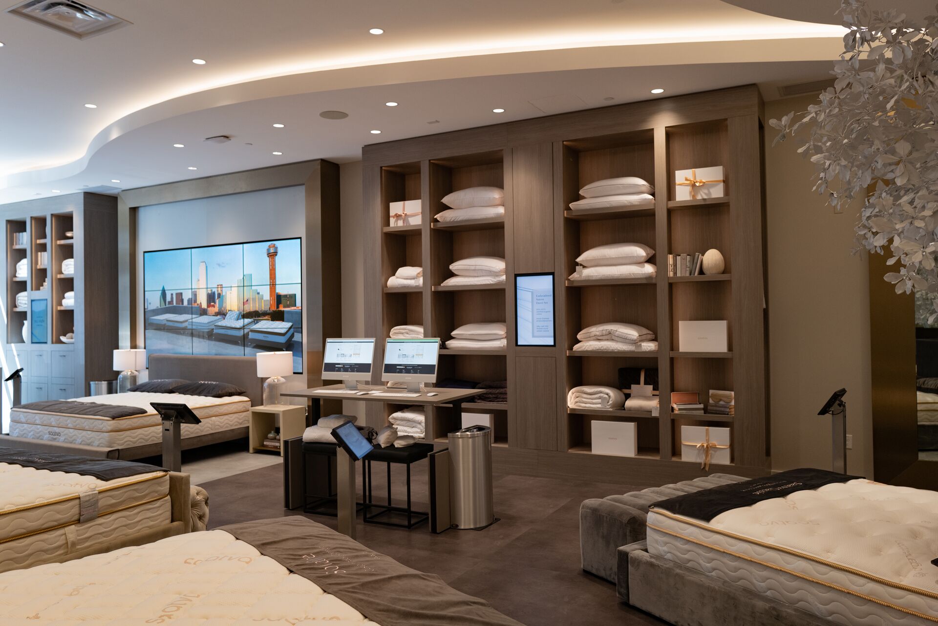 “One of the first elements you experience is the incredible architecture of the ceiling,” said Hines. The coved ceiling, with its undulating lines, guides visitors through the store as other design features layer on and contribute to that flow. There are numerous ‘wow’ moments throughout the interior, including a 6-by–10-foot changing digital display wall that allows customers to experience a Saatva mattress in the setting of their choice. Like all Saatva Viewing Rooms, Saatva Dallas is designed to be a relaxed, self-guided space where customers can use technology to interact with, and learn about, products at their own pace.