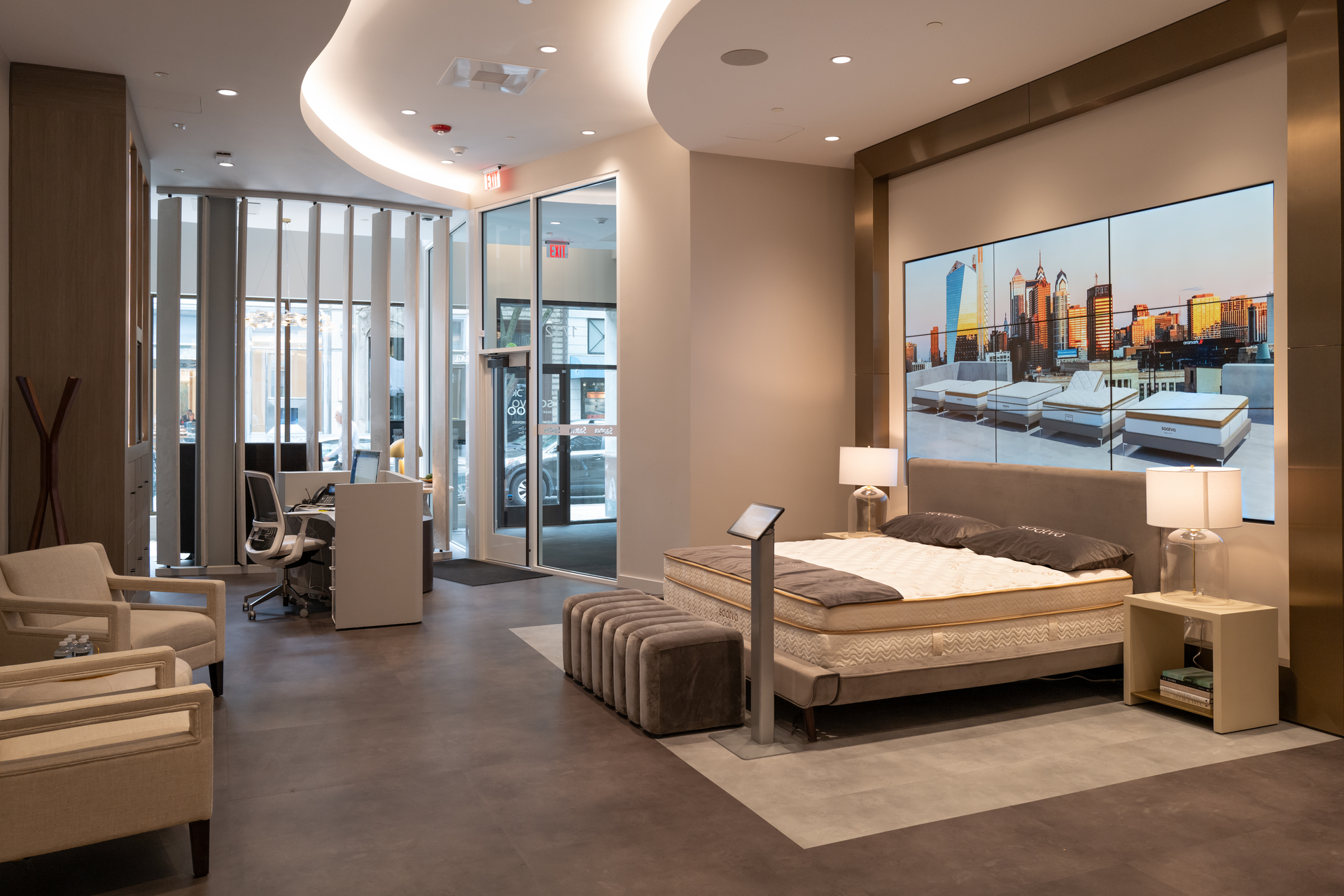 Thanks to a partnership with Samsung, the Philadelphia Viewing Room is outfitted with state-of-the-art displays and the latest behavior-sensing technology to help customers discover, personalize, and build their ideal sleep experience. In addition to the digital  “hero” wall, composed of nine Samsung VM46T-U 46-inch Full HD Ultra-Narrow Bezel Video Wall Displays,  information kiosks at each bed display allow visitors to interact with the collection at their own pace, with knowledgeable Sleep Guides on hand to assist and answer questions.