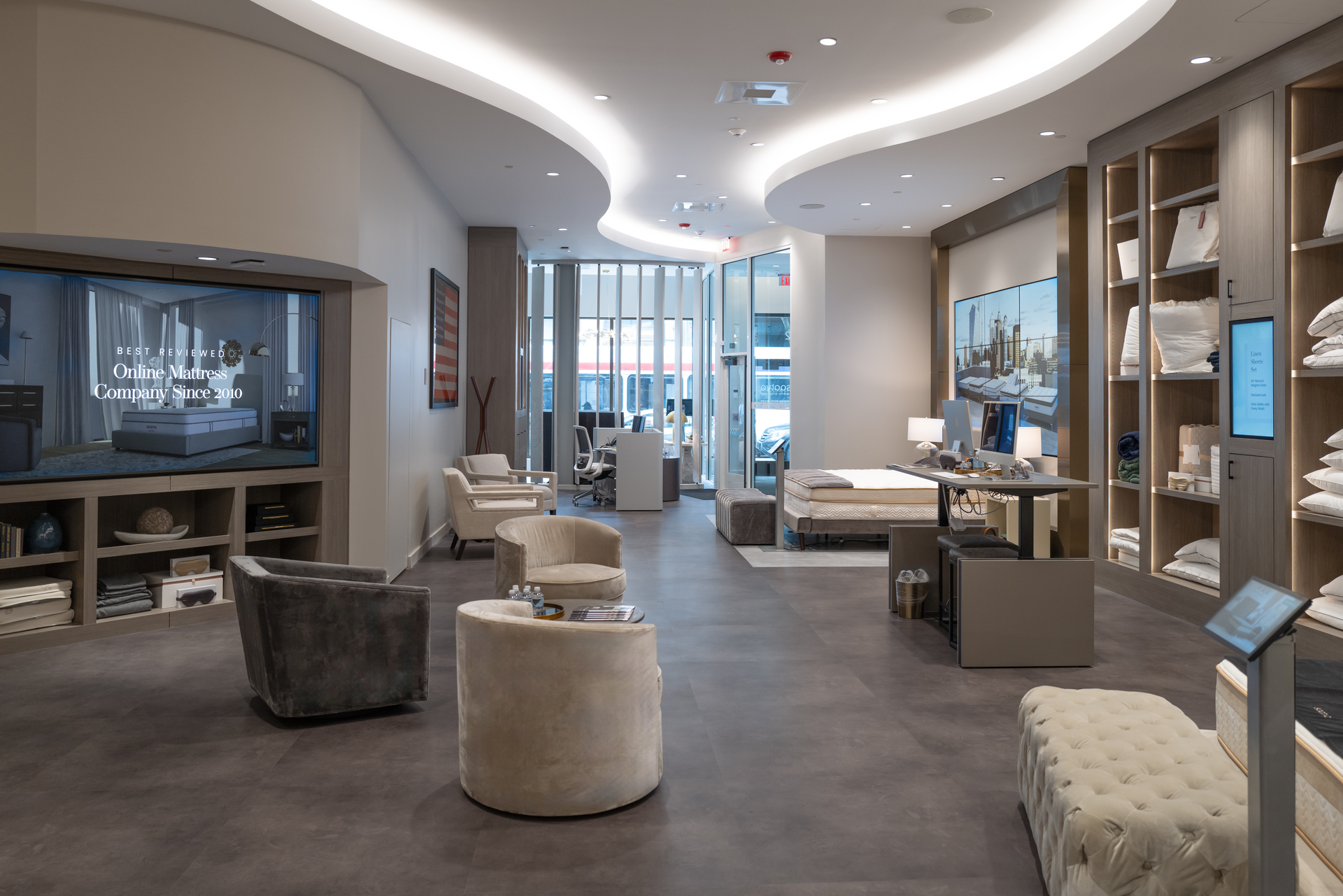 “One of the first elements you experience is the incredible architecture of the ceiling,” said Hines. The coved ceiling, with its undulating lines, guides visitors through the store as other design features layer on and contribute to that flow. There are numerous ‘wow’ moments throughout the interior, including a 6–by–10–foot changing digital display wall that allows customers to experience a Saatva mattress in the setting of their choice. Like all Saatva Viewing Rooms, Saatva Philadelphia is designed to be a relaxed, self-guided space where customers can use technology to interact with and learn about products at their own pace.