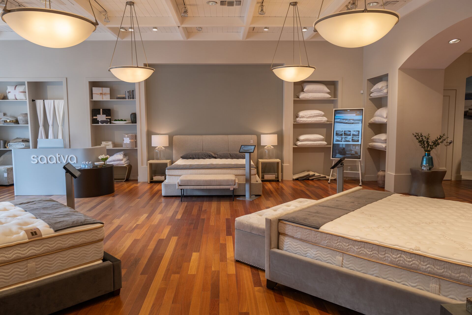 “One of the first elements you experience is the incredible architecture of the ceiling,” said Hines. Its coffered design, paired with pendant chandeliers, guides visitors throughout the space as other design features layer on and contribute to that flow. There are numerous ‘wow’ moments throughout the interior, that allow customers to experience all of Saatva’s made-to-order mattress options, sleep essentials, and home furnishings to help them create their perfect sleep sanctuaries. Like all Saatva Viewing Rooms, Saatva San Diego is designed to be a relaxed, self-guided space where customers can use technology to interact with, and learn about, products at their own pace.
